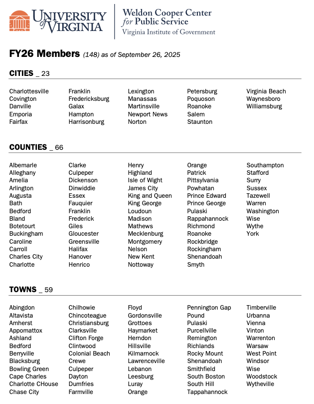 Thank you to the Virginia Institute of Government FY26 members for your support!